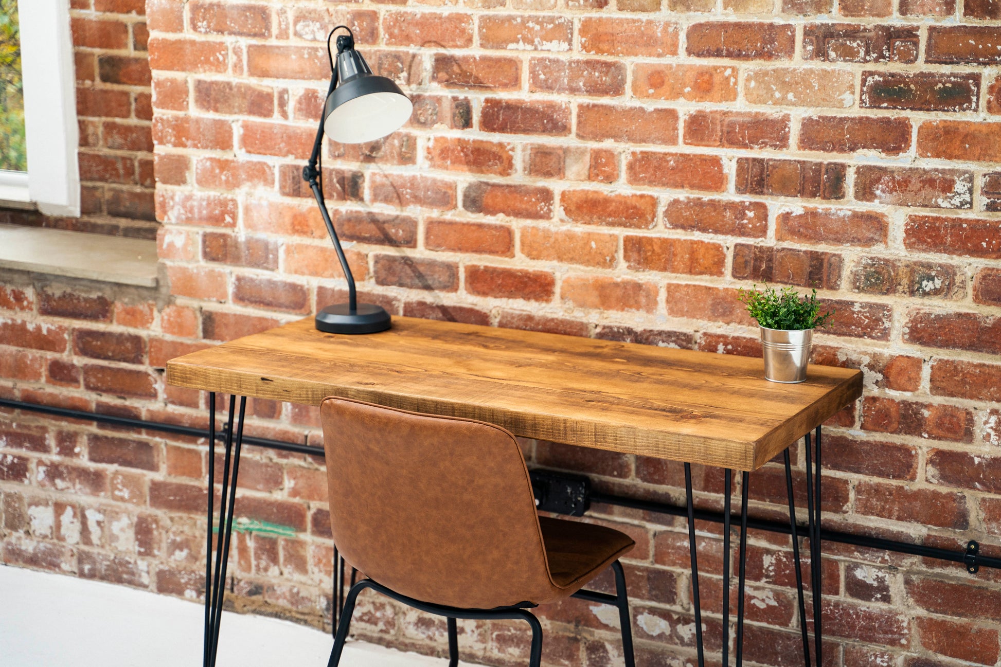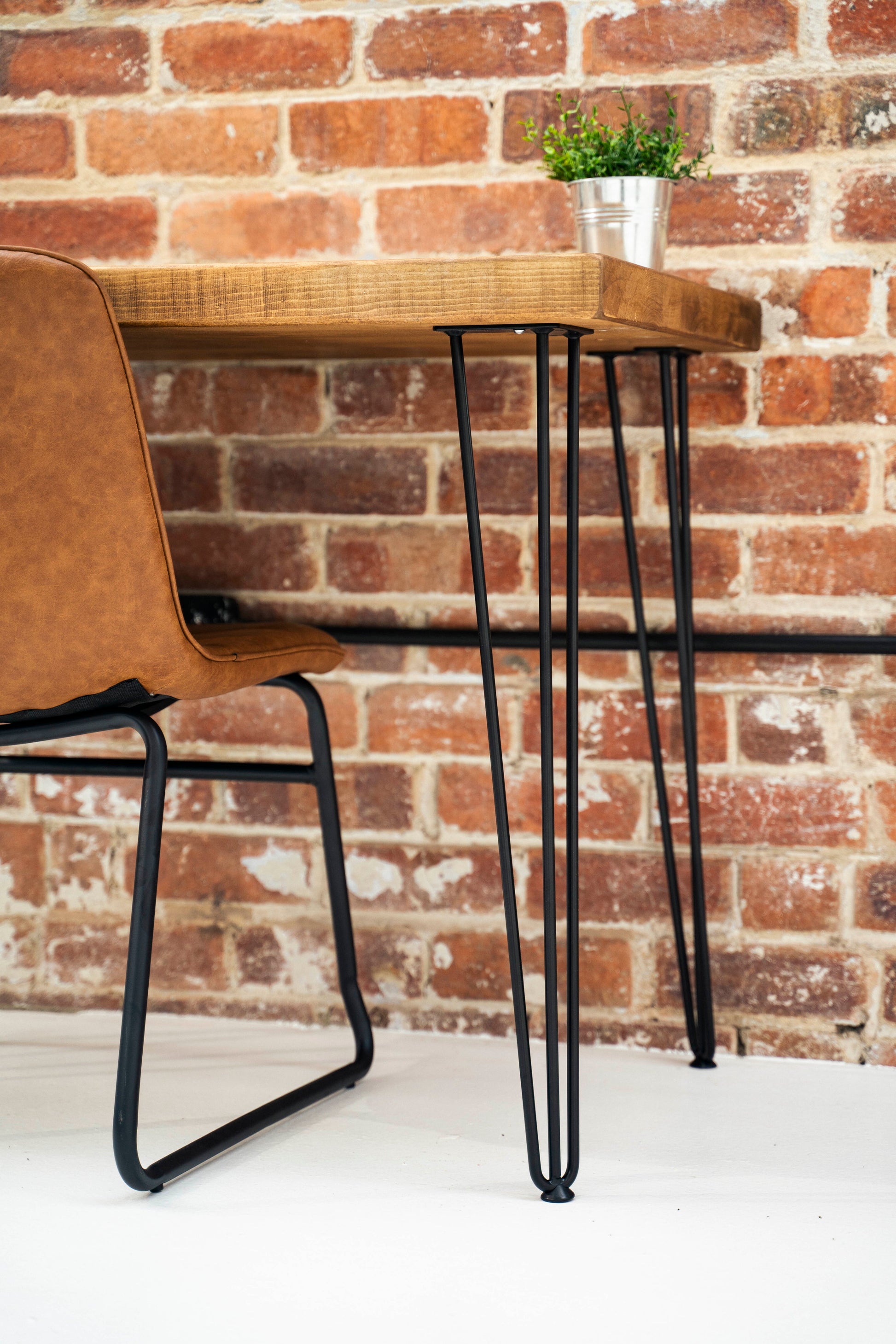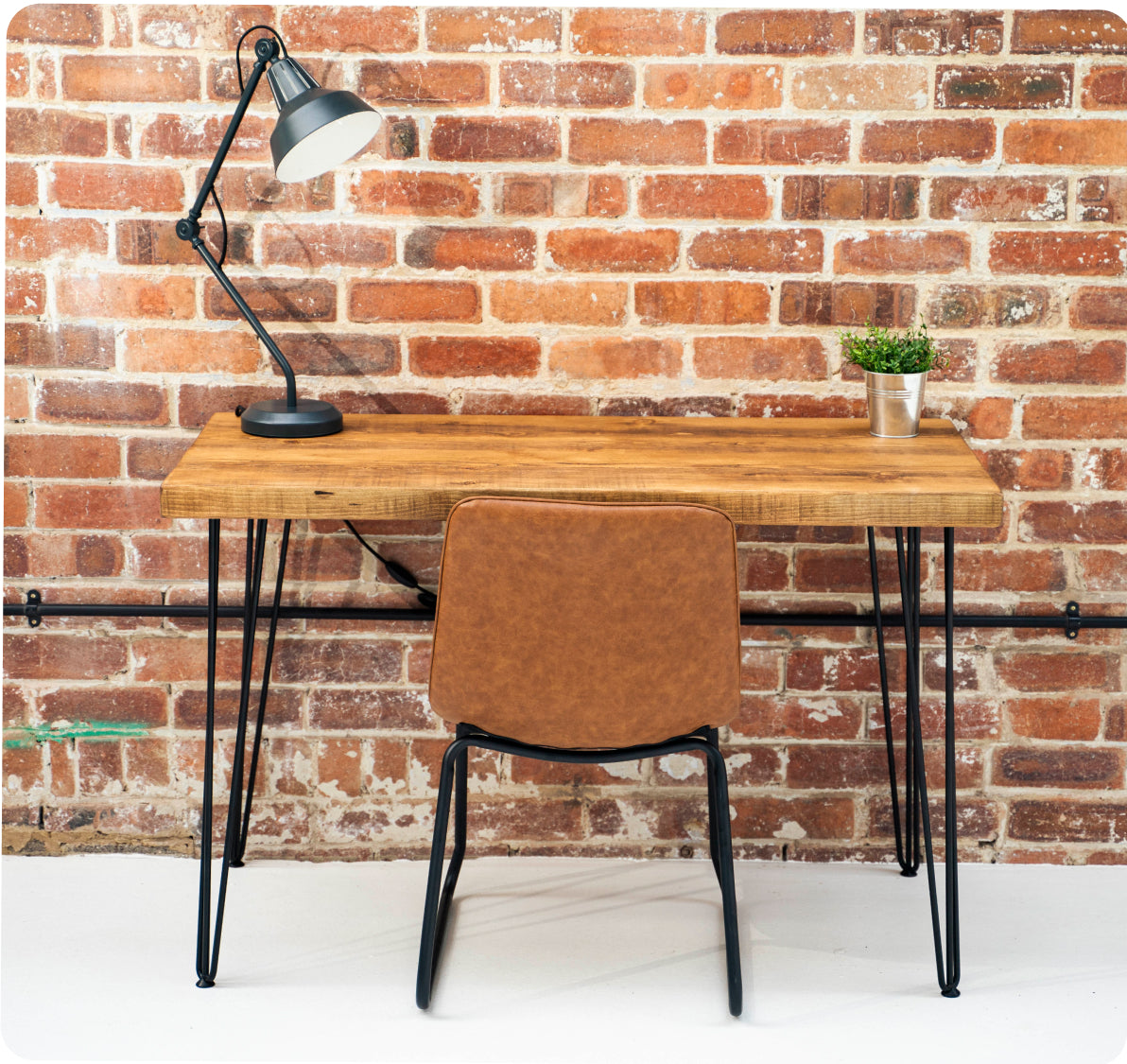 The desktop is made from Chunky pine wood that is sourced from environmentally sustainable forests and kiln-dried to the moisture content of the average household. The top is sanded to a smooth touch finish, but we make sure to preserve each piece's rustic characteristics, including splits, knots, marks and unique grain patterns to give a rustic / reclaimed feel. Once sanded, a wax finish is then applied to offer protection to the wood and help intensify the character of the wood. 100% Natural wood is used so each wood top can vary slightly in colour depending on how the wood accepts the wax finish.