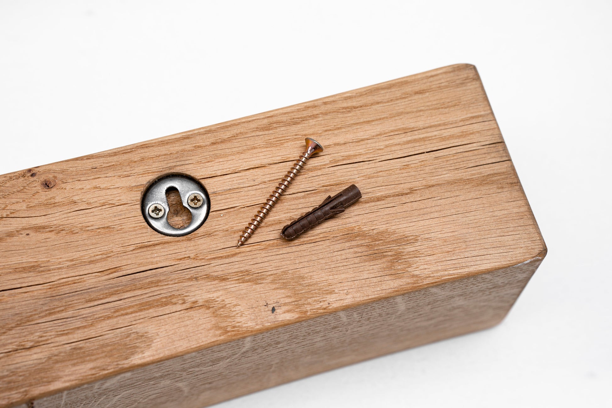 This product comes with keyhole fixings that are installed in the back of the wood. The screws and wall plugs are also provided.