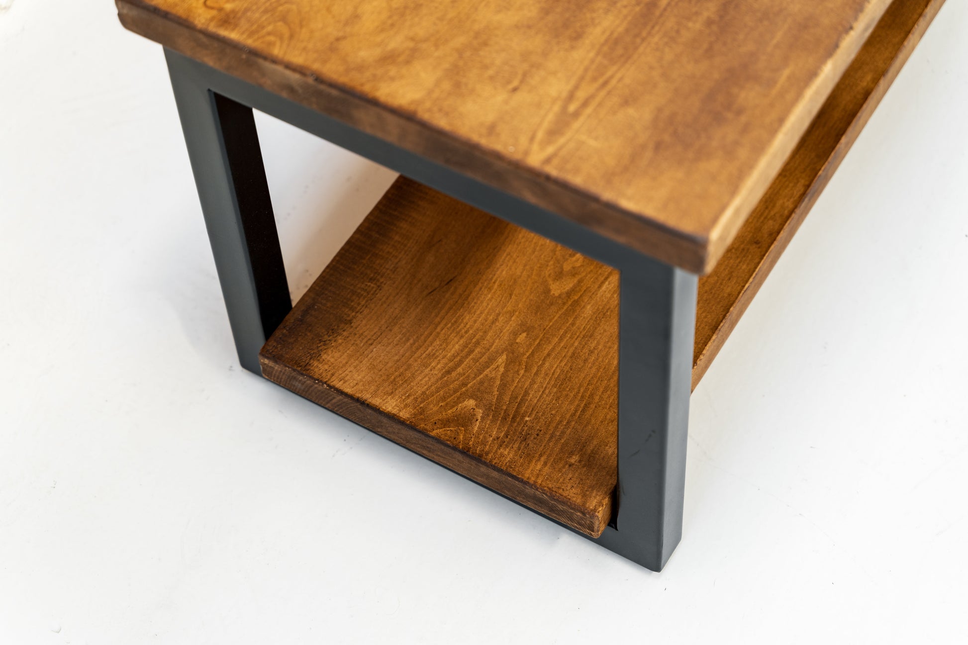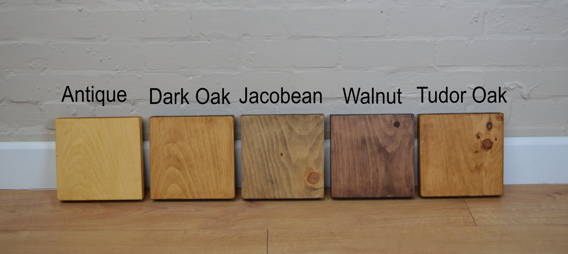We have 5 wood finishes to choose from and two leg finishes. The rustic leg option is a clear coat lacquer which will show the raw steel for an industrial effect. The black option is powder-coated black.