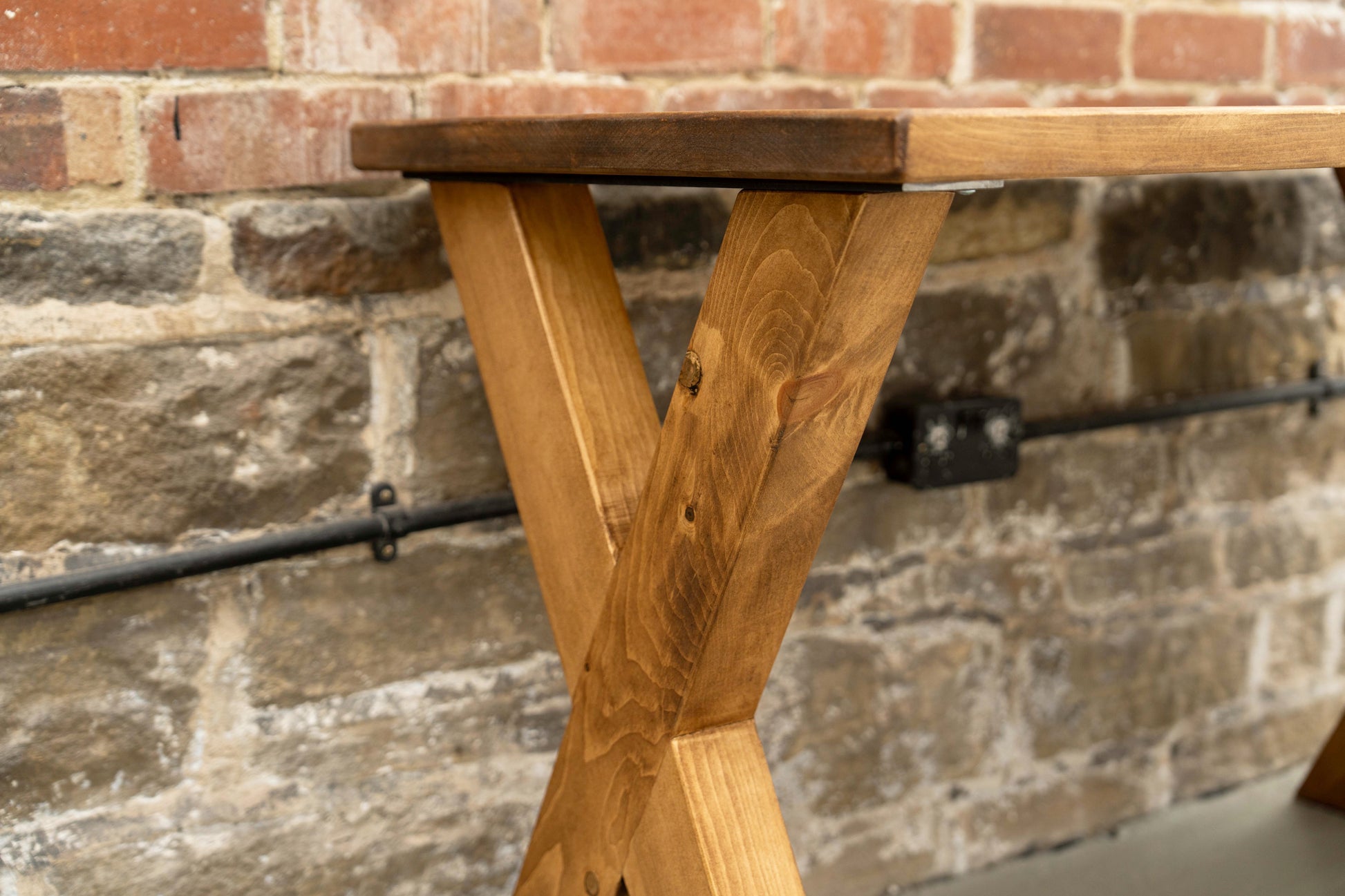 The desktop is made from Chunky pine wood that is sourced from environmentally sustainable forests and kiln-dried to the moisture content of the average household. The top is sanded to a smooth touch finish, but we make sure to preserve each piece's rustic characteristics, including splits, knots, marks and unique grain patterns to give a rustic / reclaimed look. Once sanded, a wax finish is then applied to offer protection to the wood and help intensify its character of the wood. 100% Natural wood is used so each wood top can vary slightly in colour depending on how the wood accepts the wax finish.
