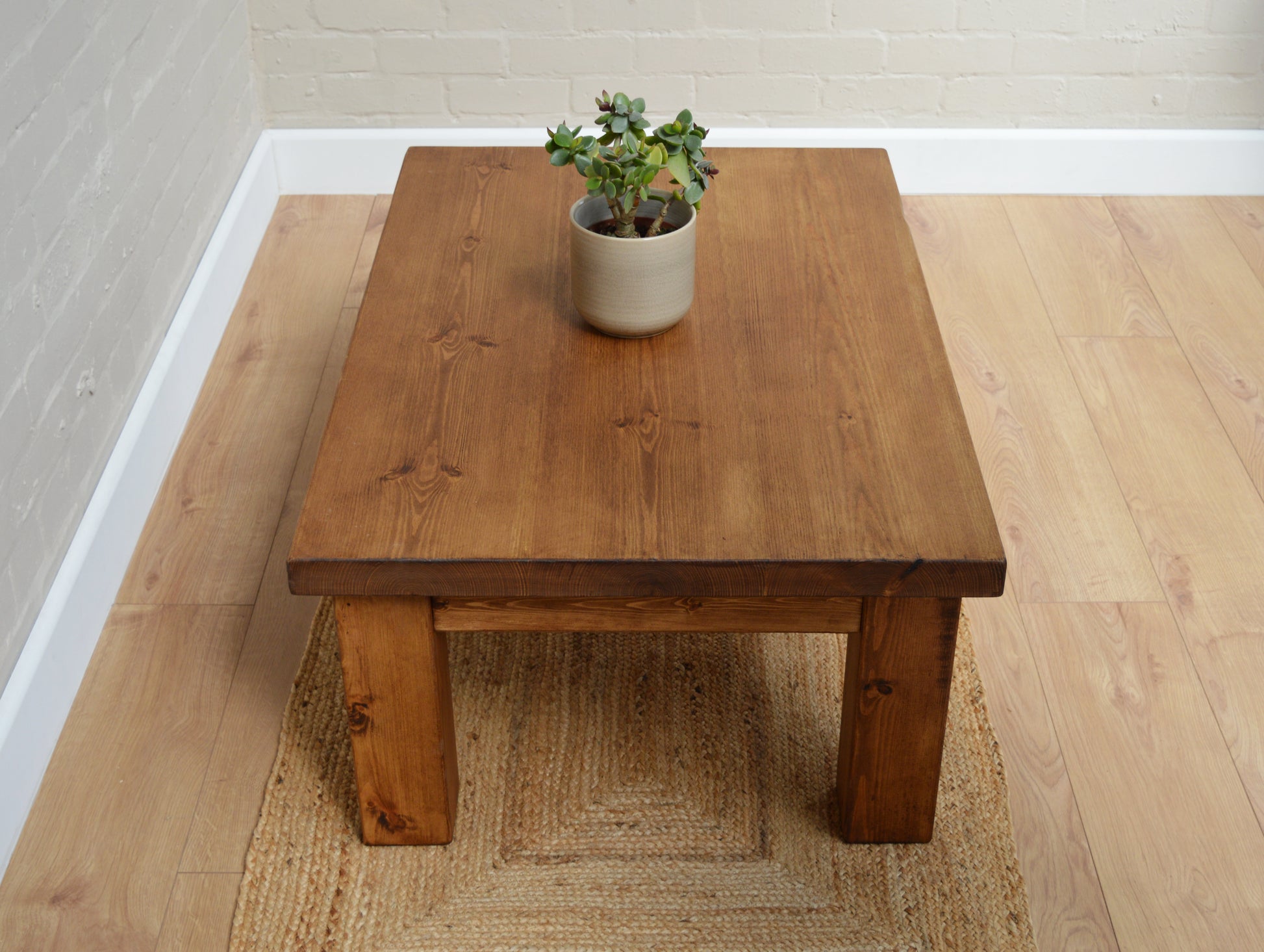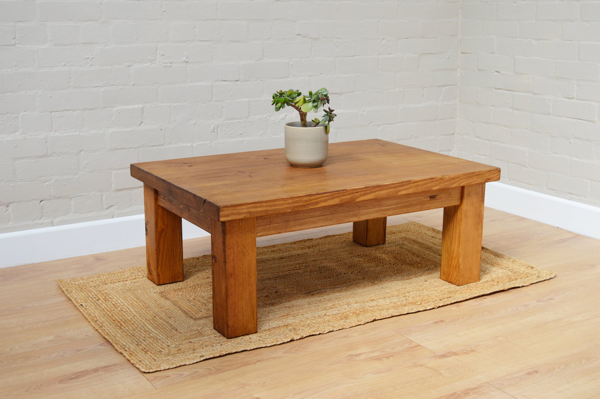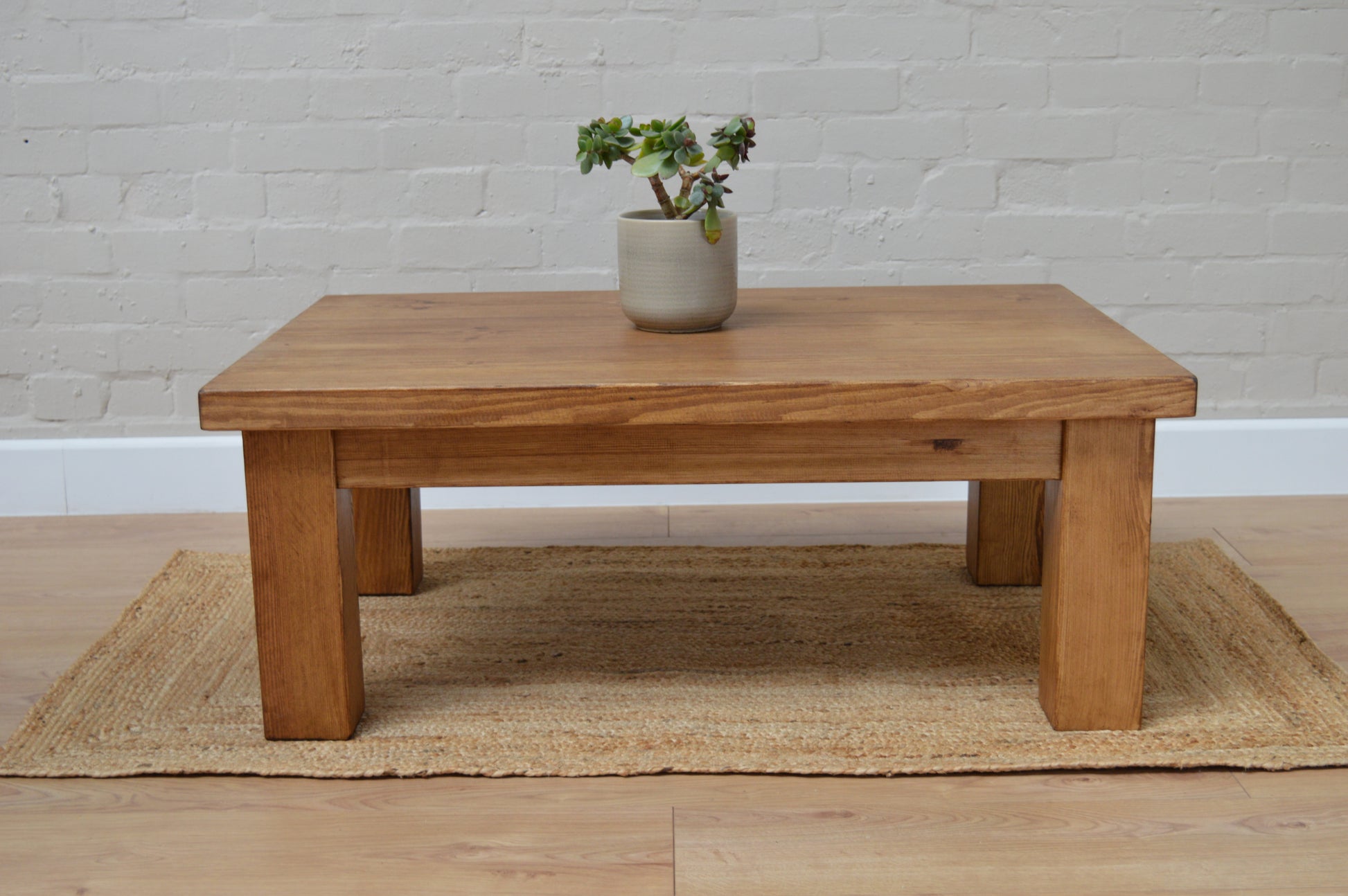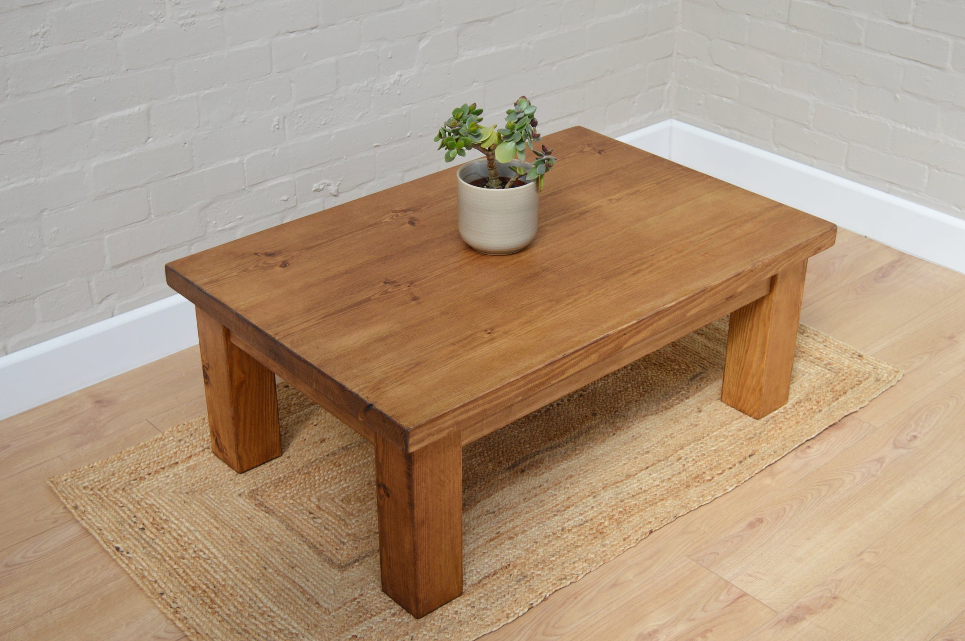 Like all our rustic range, our coffee table is handmade using Solid pine wood which is sourced from environmentally sustainable forests. The pine has been kiln-dried to the moisture content of the average household, this is crucial when using wood on interior furniture as it minimizes any movement in the wood. The top is planned, then sanded to a touch finish, but we make sure to preserve each piece's rustic characteristics, knots, and unique grain patterns. Once sanded, a wax finish is then applied to offer protection to the wood, leaving a stunning finish.