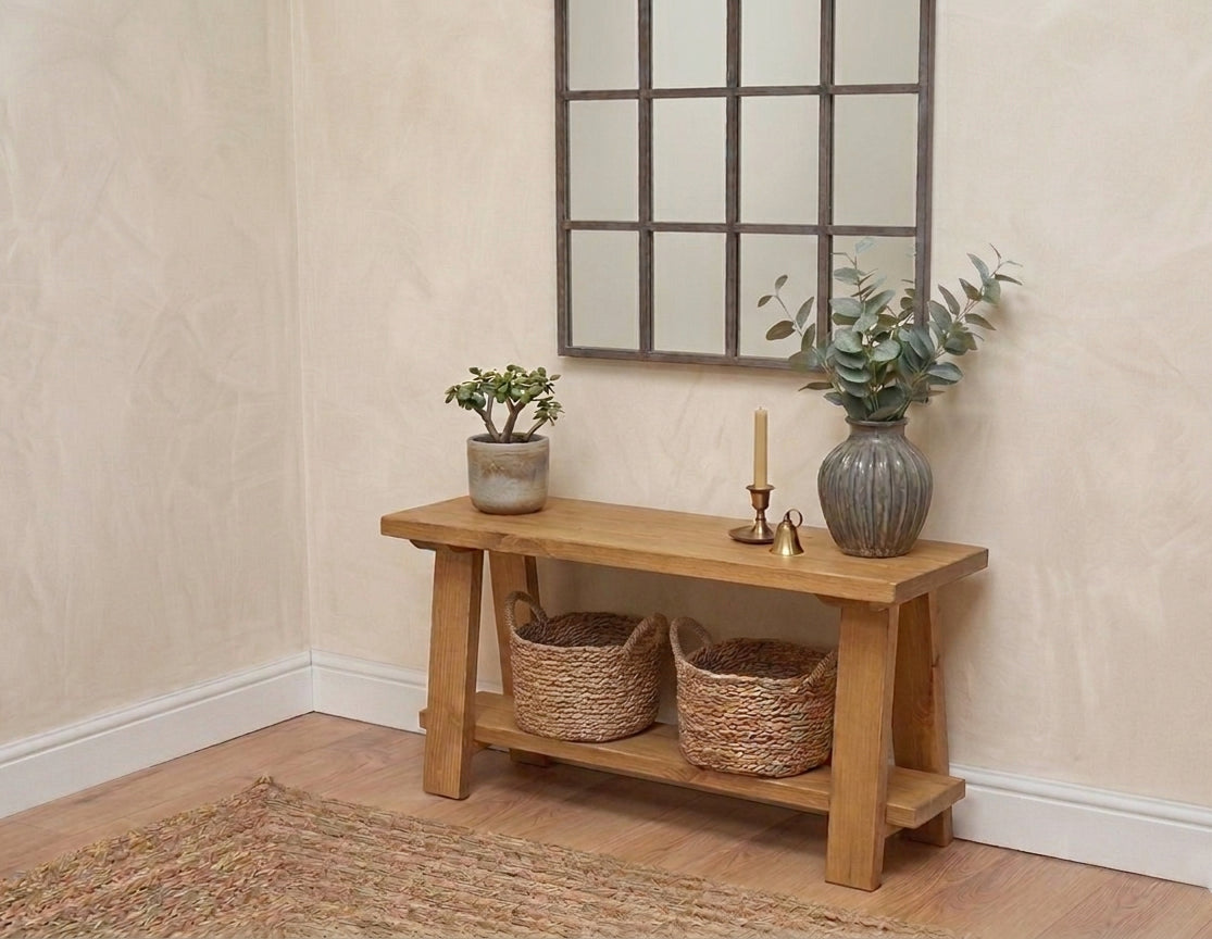 FINISH - FINISH - The pine is sanded to a smooth touch finish, but we make sure to preserve the rustic characteristics each piece has which will include, splits, knots, and unique grain patterns. Each console table is hand-waxed or oiled with a natural beeswax or hardwax oil finish. The application of wax/oil intensifies the grain pattern whilst protecting the pine with a water-resistant finish.